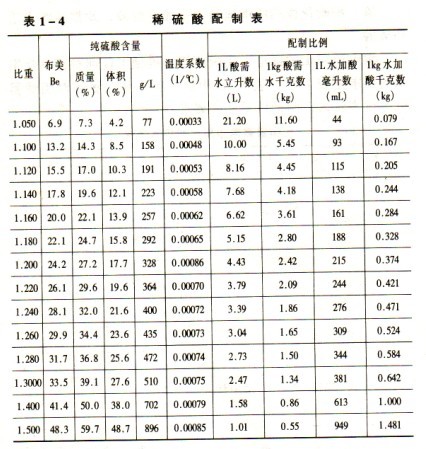 制取純水的方法有蒸餾法、陰陽樹脂交換法、電阻法、離子交換法等。因水中的雜質(zhì)是鹽類離子,所以水的純度用電阻率來表示。國內(nèi)制造廠主要用離子交換法制取。其總含鹽量小于lm9/l,水電阻率為(80~1000)×104Ω.mm(25 0C)。鉛酸電池電解液(稀硫酸)配制見表l-4。濃硫酸加入水稀釋,會發(fā)生體積收縮,故混合體積值應(yīng)適當(dāng)增大。