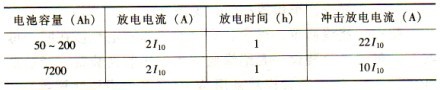 1)100%容量沖擊電流放電能力。當(dāng)蓄電池容量達(dá)到滿容量時(shí),對(duì)容量為50~200Ah的電池用25I10沖擊電流值,容量大于200Ah的電池用20I10沖擊電流值,沖擊l0次,每次500ms的沖擊放電,每?jī)纱畏烹姇r(shí)間問(wèn)隔為2s,直流母線的電壓不得低于90%UN(UN為直流系統(tǒng)額定電壓)。