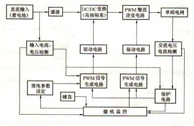 反向單相交流輸出,包含高頻直流變換電路和單相PWM整流逆變電路。高頻直流變換電路控制蓄電池恒流放電和起到與交流電網(wǎng)電氣隔離作用;PWM是將蓄電池釋放的能量反饋回電網(wǎng)。