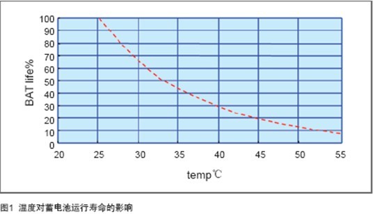 失水的途徑比較多:節(jié)流閥設(shè)計(jì)不合理,頻繁開(kāi)啟;電源對(duì)蓄電池頻繁均充;環(huán)境溫度過(guò)高。其中高溫是最主要的因素,高溫會(huì)加速蓄電池失水速度,導(dǎo)致蓄電池容量下降。以25℃為基準(zhǔn),當(dāng)蓄電池運(yùn)行環(huán)境上升10℃,壽命減少50%,如圖1所示。