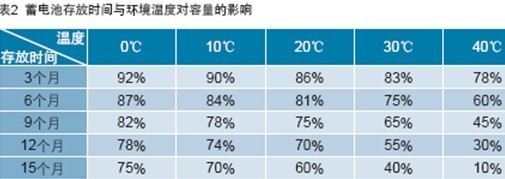 蓄電池在存放過(guò)程中存在自放電,如果長(zhǎng)時(shí)間得不到補(bǔ)充,就會(huì)出現(xiàn)硫酸鹽化現(xiàn)象。這種現(xiàn)象如果沒(méi)有得到及時(shí)改善,蓄電池容量會(huì)降低甚至損壞不能使用。蓄電池在存貯過(guò)程中,環(huán)境溫度對(duì)容量影響也非常大,如表2所示。